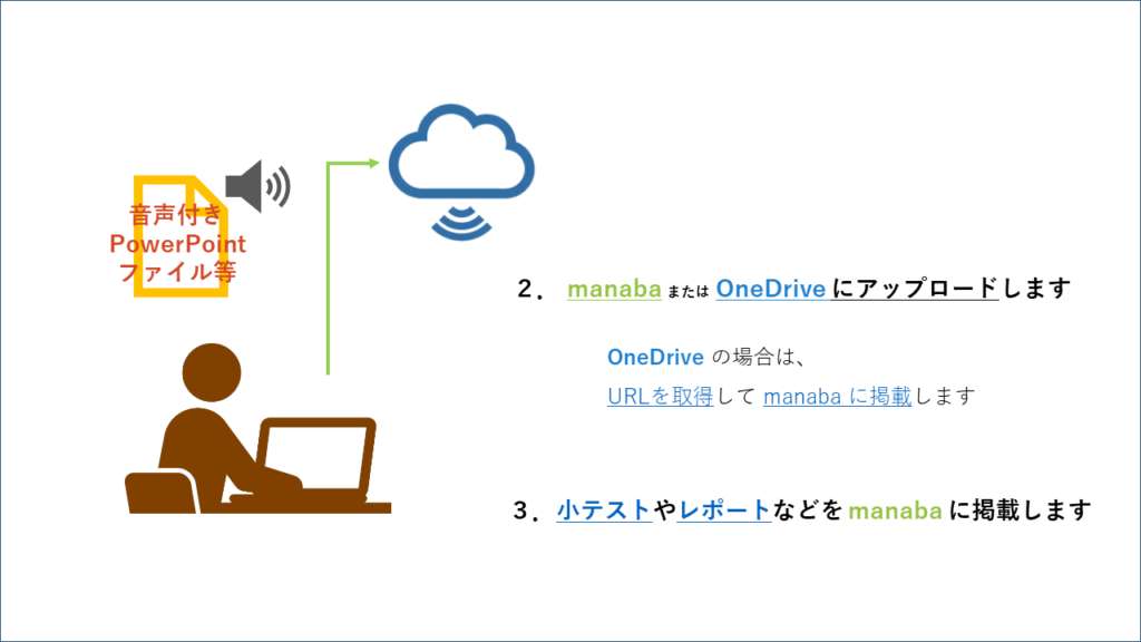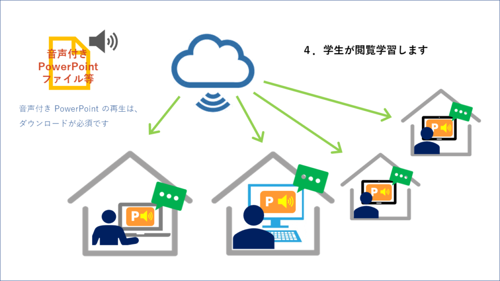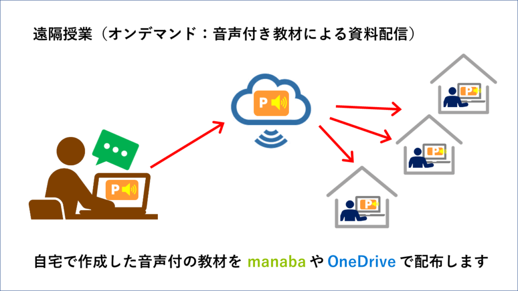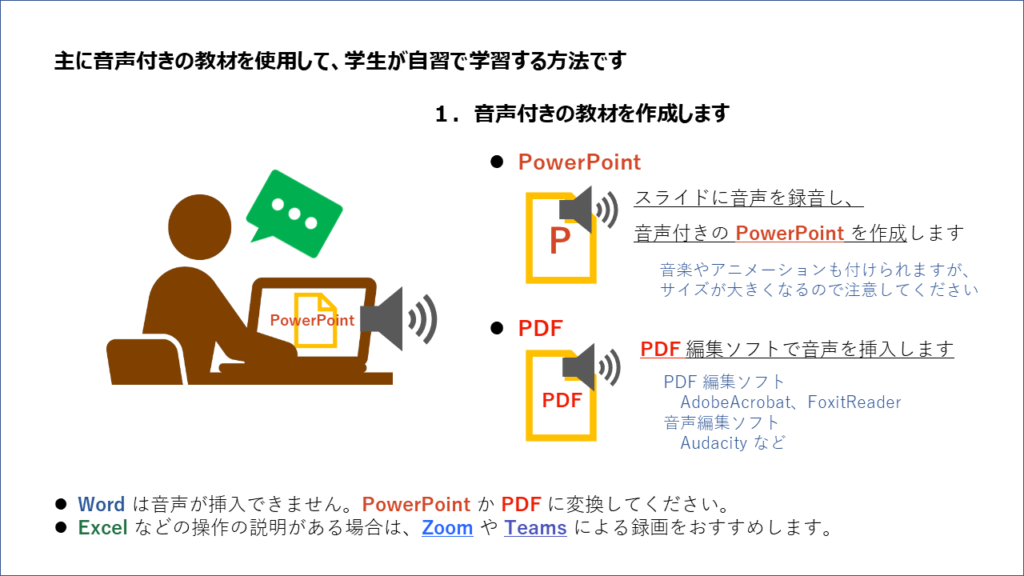 | PowerPoint | 音声付きの教材を作成します(どちらか一方) |